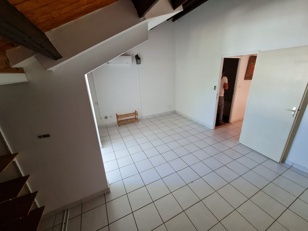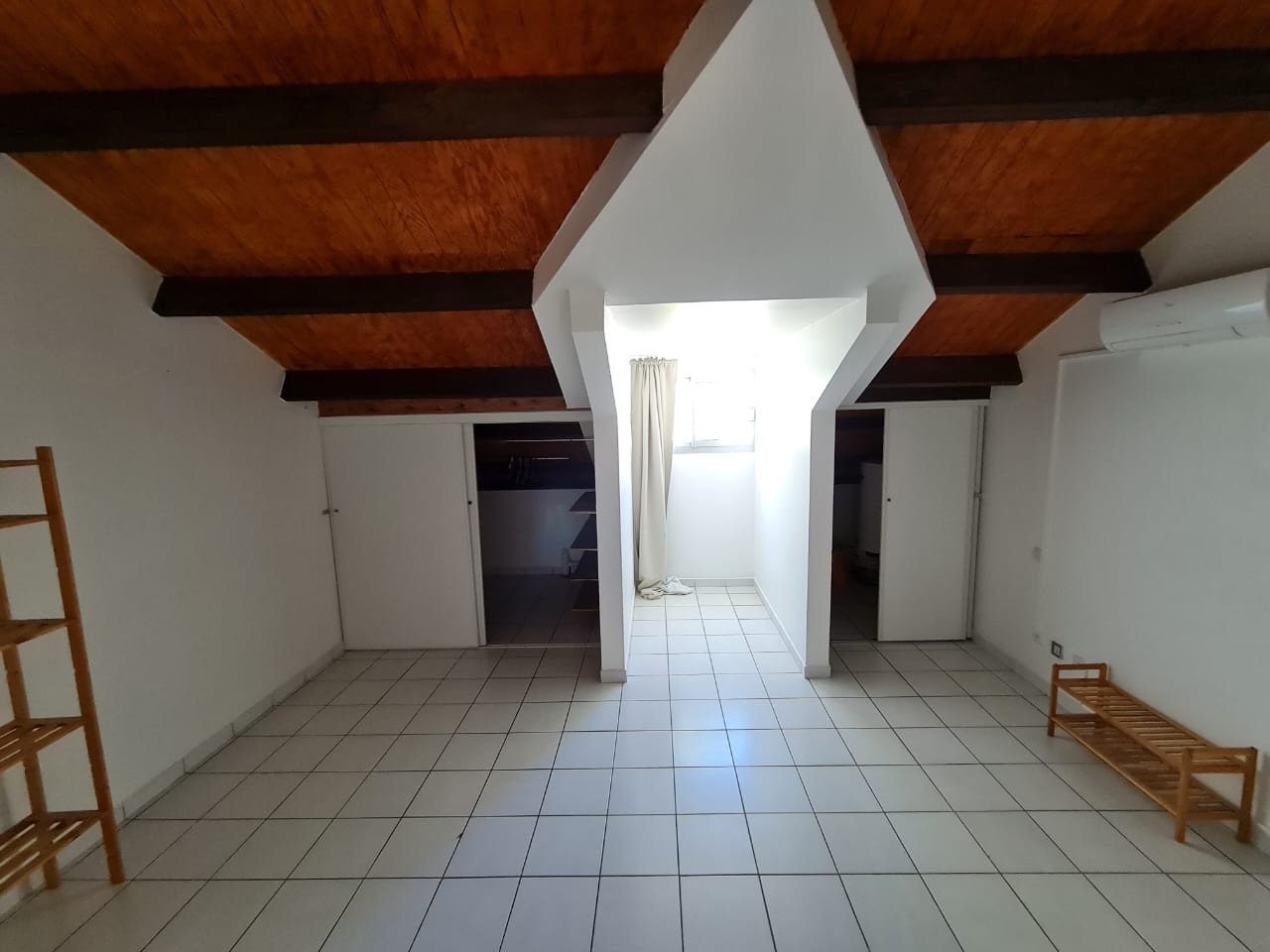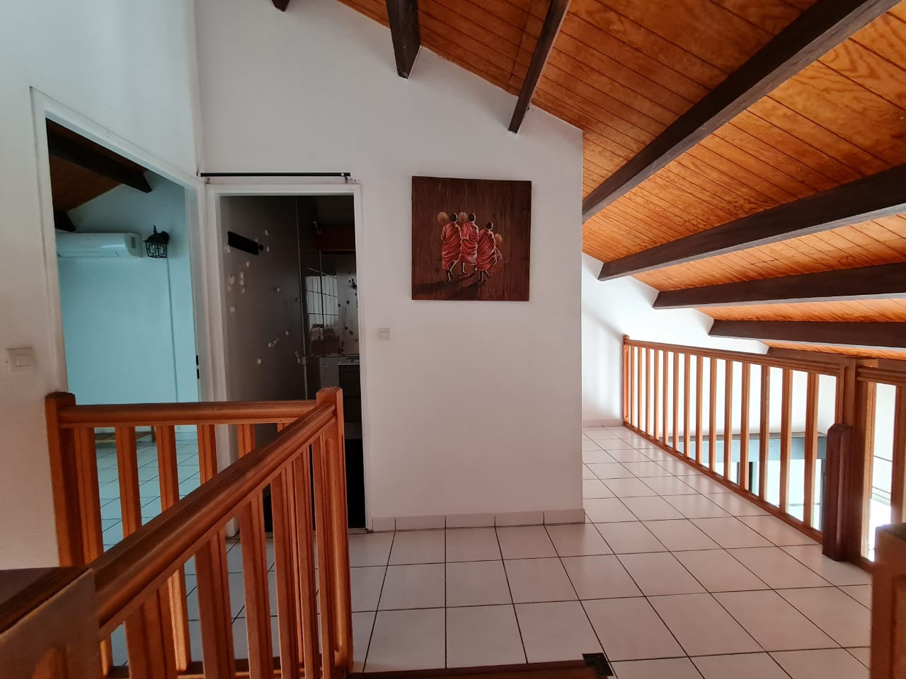 À l’étage : une salle de bains, une grande chambre équipée de deux placards, ainsi qu’une mezzanine d’environ 15 m² pouvant servir de chambre supplémentaire, bureau ou espace détente.
