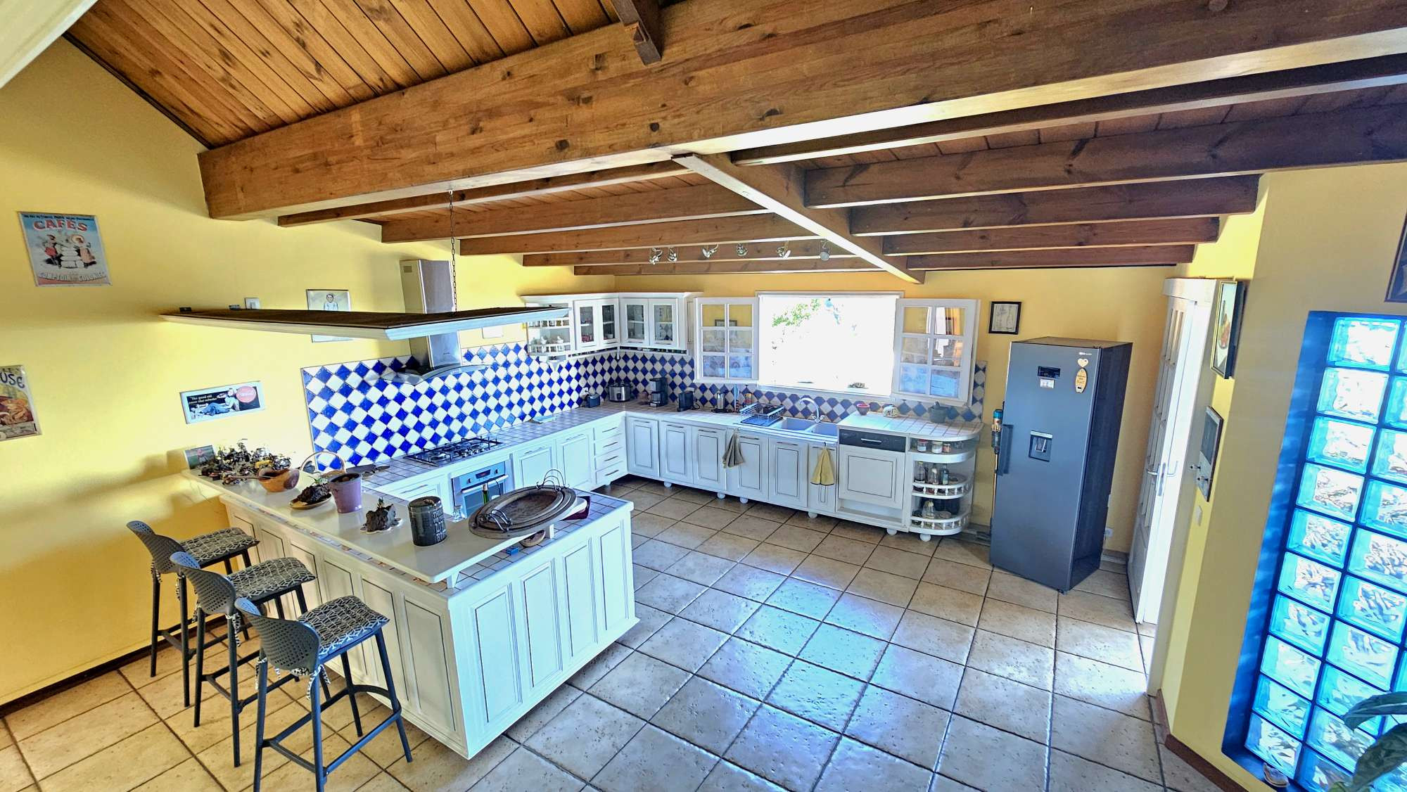 On y retrouve le vaste séjour / salle à manger qui se prolonge par une grande varangue de plus de 30 m² offrant une vue imprenable sur la mer et la montagne. La cuisine, conçue avec des matériaux de qualité, bénéficie d'un accès à la varangue d'un côté mais également à l'espace extérieur, idéal pour recevoir, avec piscine, table à manger et cuisine extérieure.