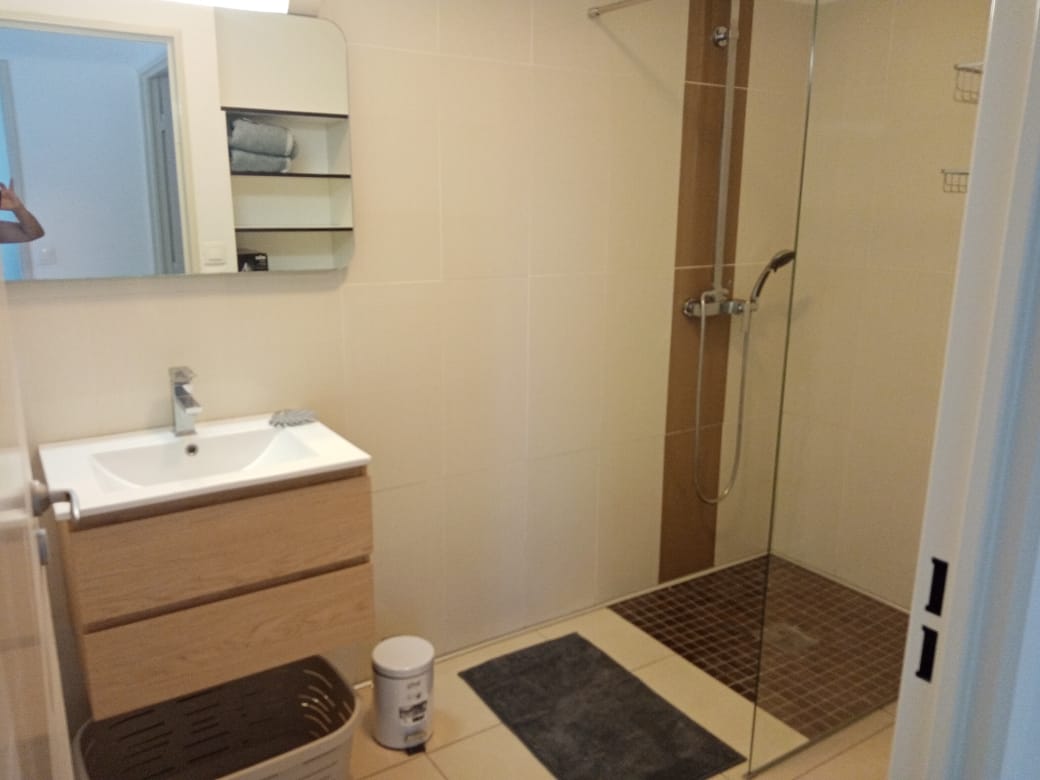 L'appartement comprend un séjour, une cuisine équipée de standing, avec plaque de cuisson, hotte aspirante et plusieurs placards. Une chambre avec vue mer, placards, climatisation et volet électrique.