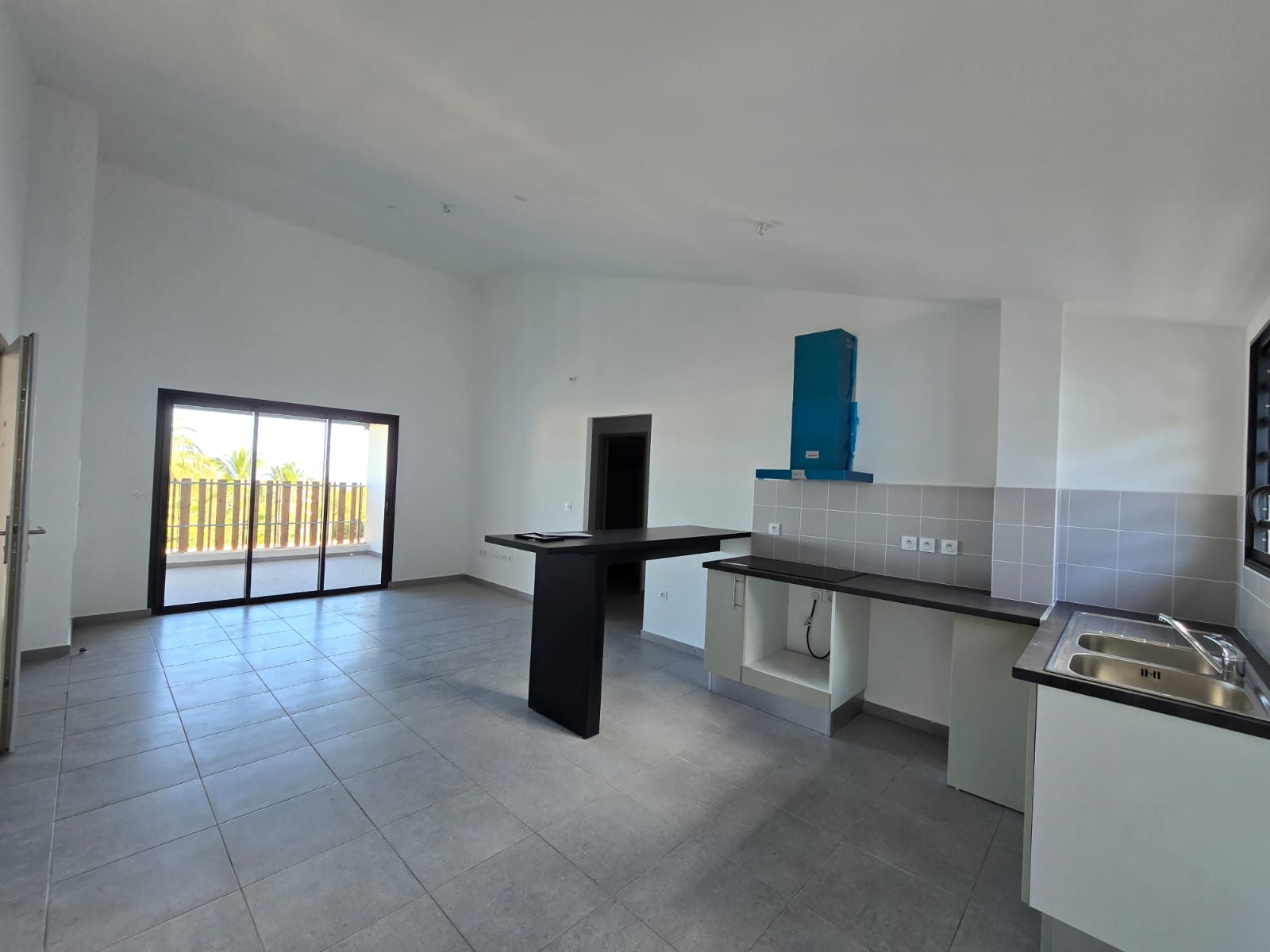 un séjour avec une cuisine équipée de plaque de cuisson, hotte aspirante et placards, deux chambres, une salle d'eau et un WC séparé.