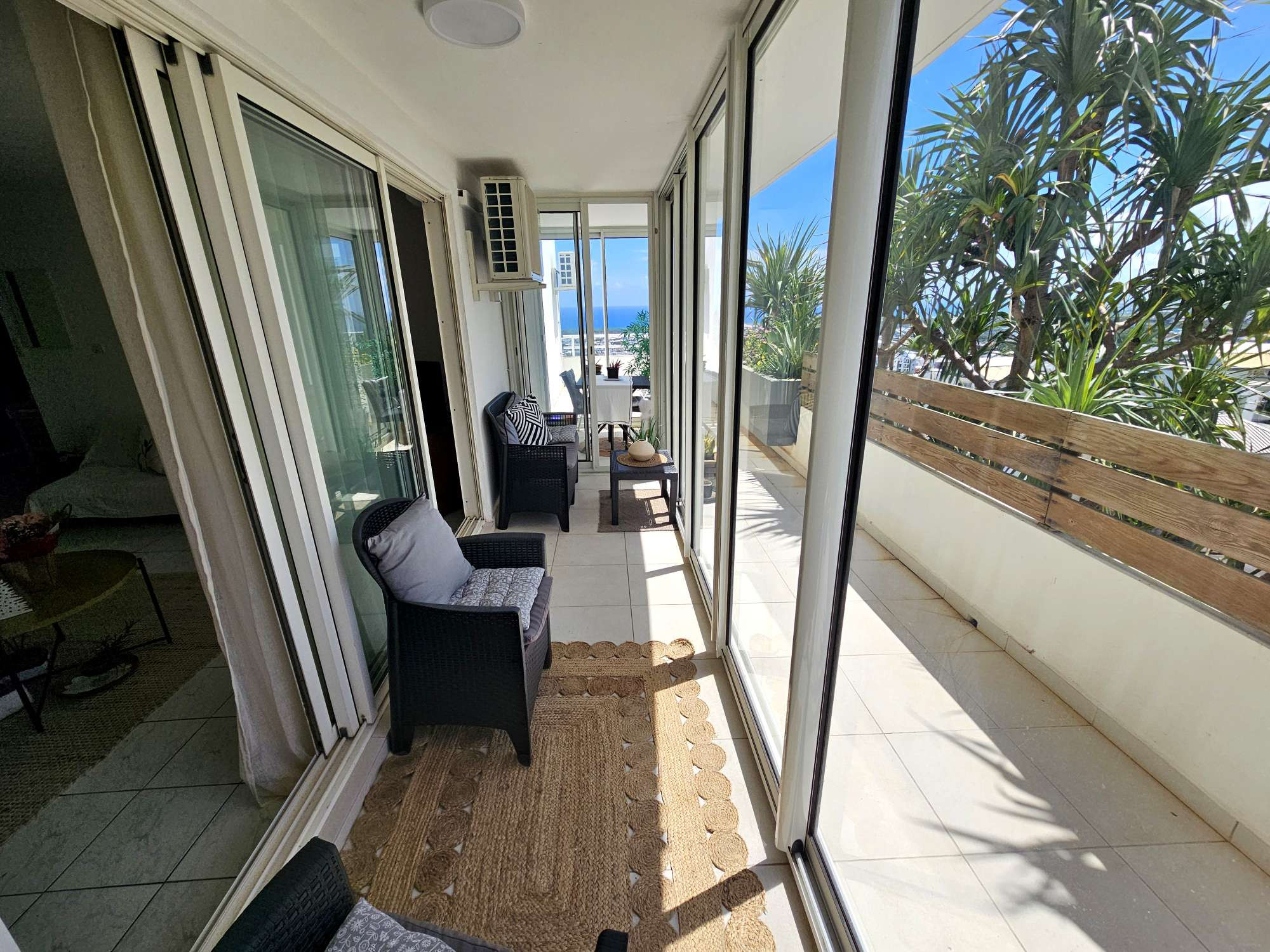 De l'autre côté de l'appartement, un dégagement distribue les 2 chambres : Une première avec placard par laquelle on peut rejoindre la varangue fermée et la 2e chambre climatisée qui donne quant à elle entièrement vers la mer et la vue magnifique. Une très belle salle de bain entièrement rénovée et un WC séparé.
