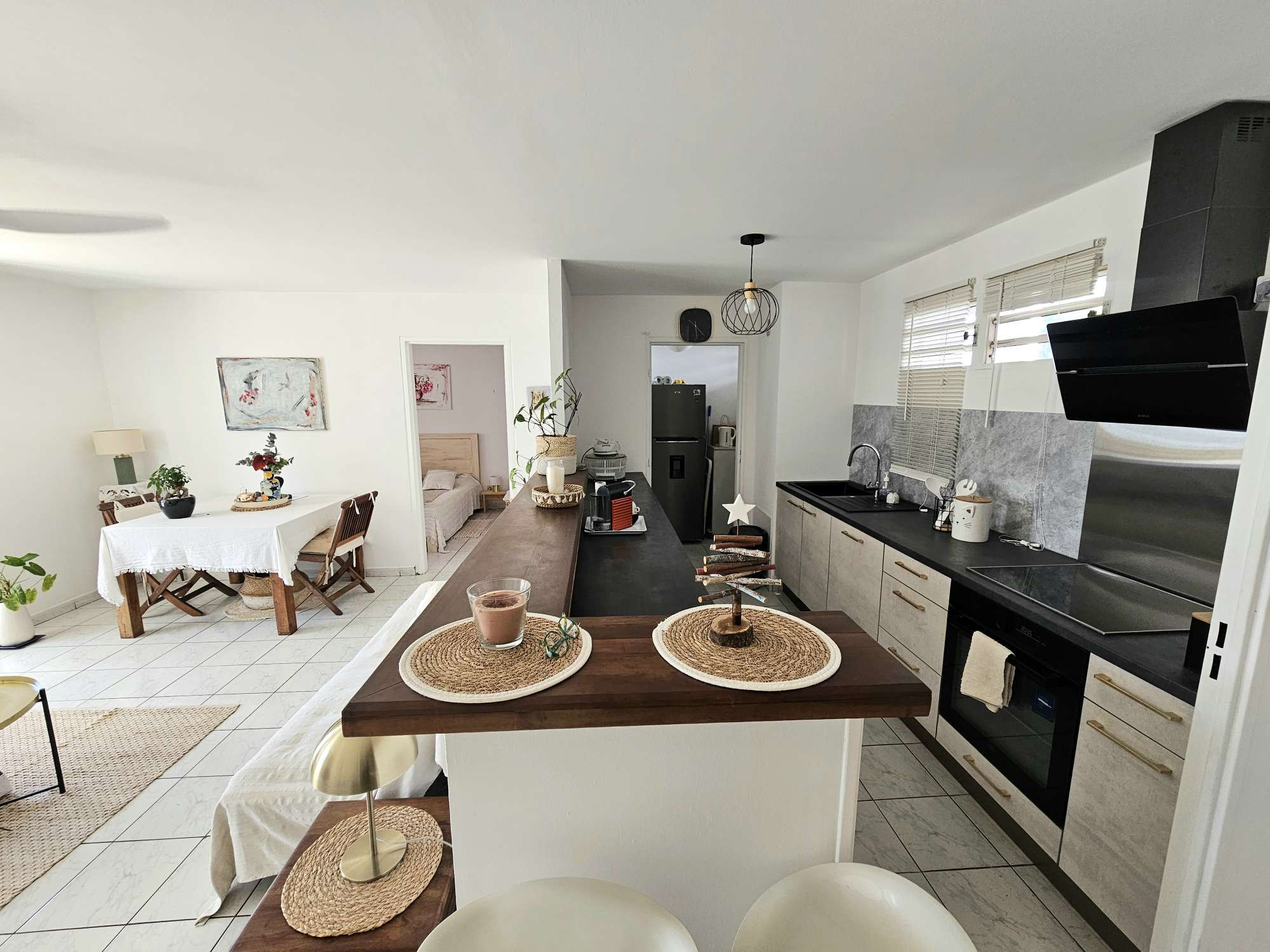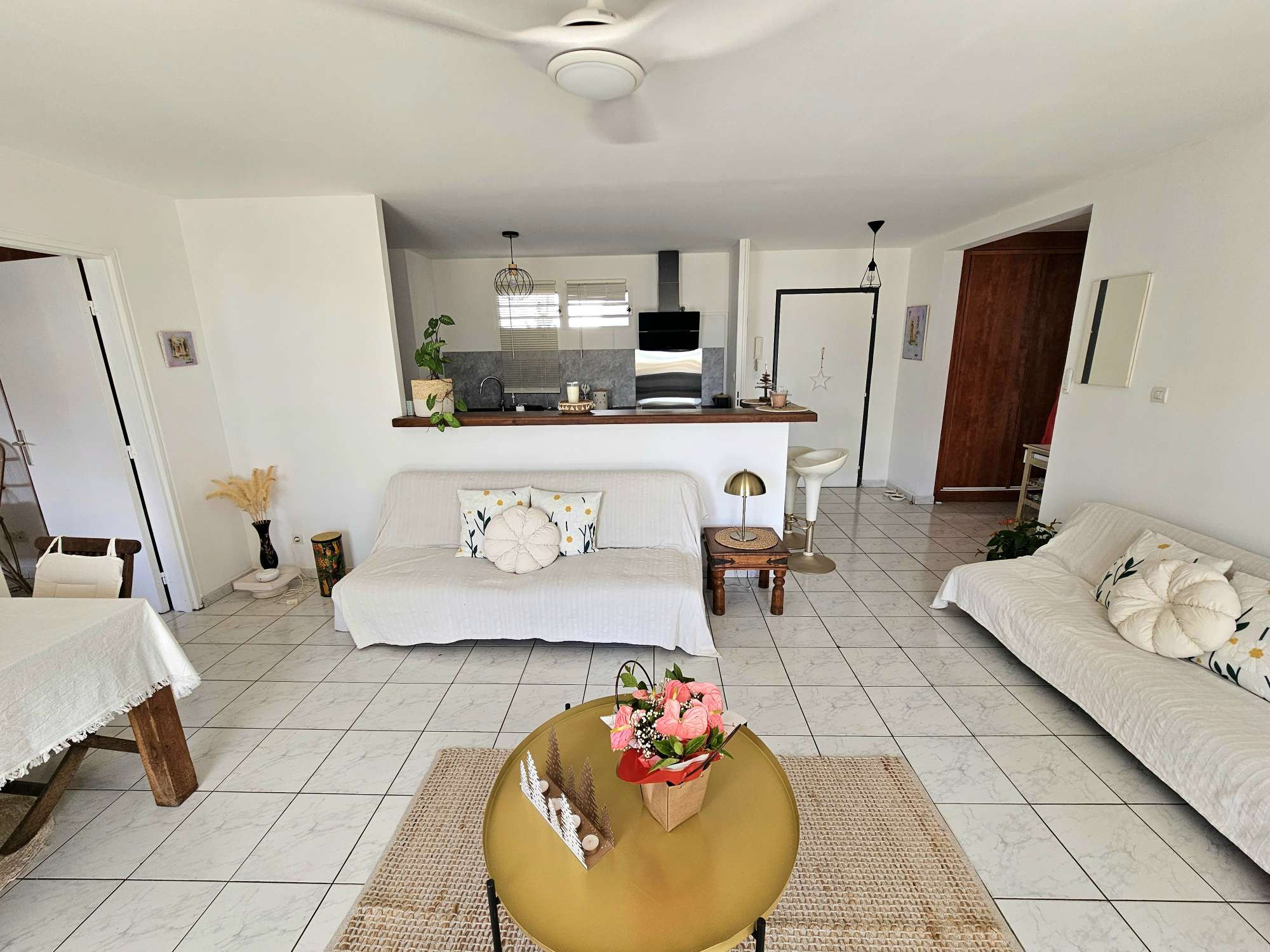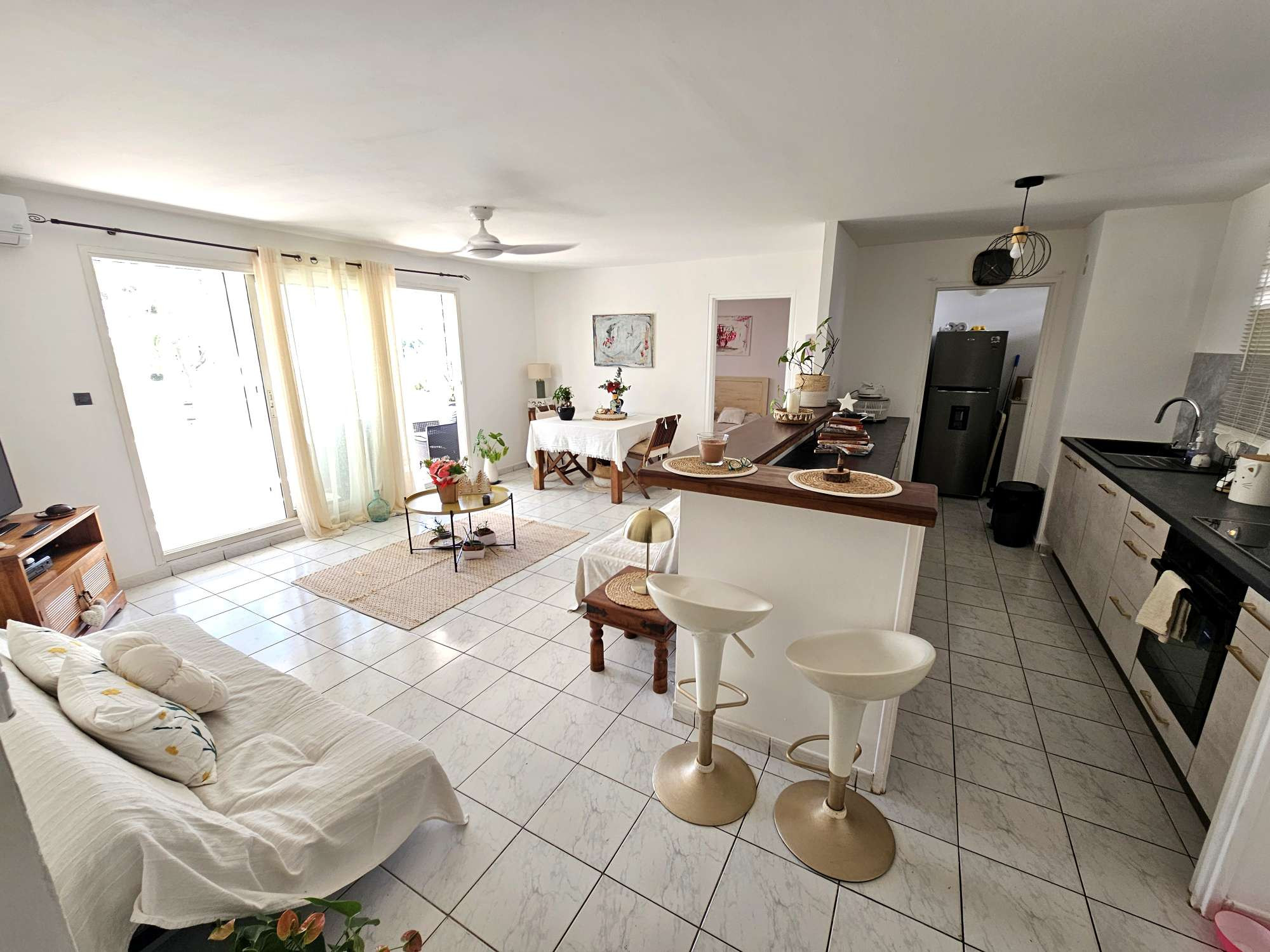 L'appartement se compose de la façon suivante. Une entrée avec un très grand placard donnant sur le grand séjour rectangulaire et la varangue fermée. Une belle cuisine ouverte sur le séjour, entièrement rénovée et bénéficiant également d'un cellier.